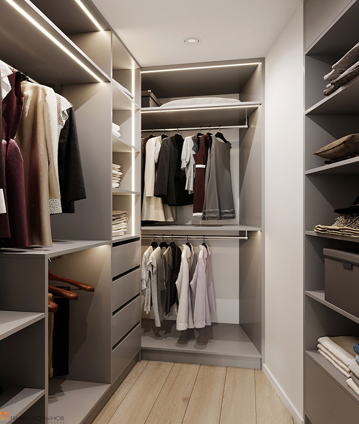 В кухне установлена техника: вытяжка, варочная панель, холодильник, посудомоечная машина. Для духового шкафа предусмотрели свободные ниши.